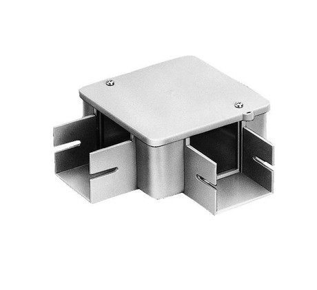 77型 ビス止めタイプ 2方出 L型 プラスチックダクトに付属の連結金具をはめ、分岐ボックスにはめ込み、ネジ締め固定します。