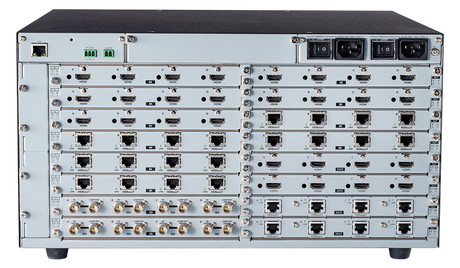 解像度4K@60、HDCP 2.2に対応した最大32入力32出力のモジュラー型マトリクススイッチャ