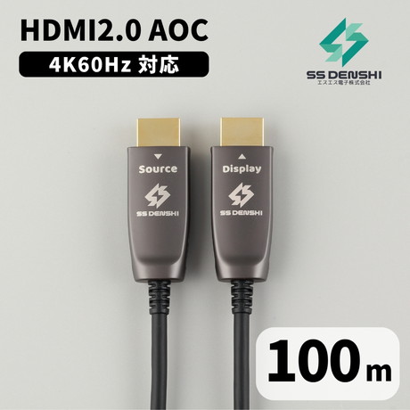 HDMI AOC(アクティブ オプティカルケーブル)はHDMI2.0 規格の18Gbps の高速伝送をサポートした光ファイバーと銅線のハイブリッド構造のケーブルです。外部電源を必要とせず、接続するだけでご使用いただけます。光信号で通信することにより解像度の高い映像信号(4K60p 対応)と高品位な音声信号の特性を損なうことなく、最大100m伝送します。また、光ファイバーを使用しているため外部電磁波ノイズに強く、細径(Φ4.8mm)かつ軽量でケーブルの取り回しに優れた製品です。