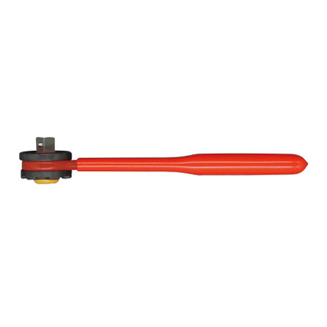 短絡防止絶縁工具差し込み角9.5mm(3/8”)72歯全長203mm最大使用電圧240V(1000V×10秒の絶縁試験済)「0.5mm厚のガラス繊維入りフッ素樹脂二重コーティングにより、通常の工具と同等の作業性を確保しています。また金属露出を最小限に抑えることで感電だけでなく、短絡を防止することが可能になりました。更にワンラッチ5°の72歯ラチェットにより、狭所でも軽快なラッチ音で作業が可能です。セット品もございます。詳細はリンク先をご参照ください。