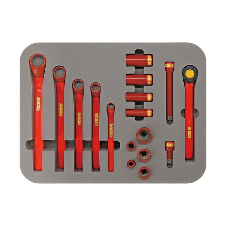 短絡防止絶縁工具【セット内容】・絶縁ソケット(差込角9.5㎜)10・13・17・19・24mm・絶縁ティープソケット(差込角9.5㎜)10・13・17・19・24mm・絶縁片口スパナ(グリップ付き)10・13・17・19・24mm・絶縁片口45°メガネレンチ(グリップ付き) 10・13・17・19・24mm・絶縁プラスドライバー+2×150 ・100・絶縁マイナスドライバー-6×150・100・絶縁平刃ニッパー・絶縁エクステンションバー(差込角9.5㎜)50.5・125.5mm・絶縁ラチェットハンドル3分角・専用収納ケース