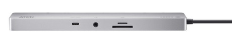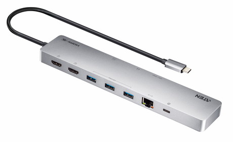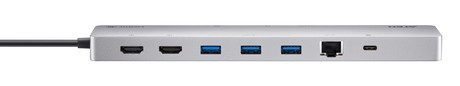 UH3240は11のポートを備えているスリムなドッキングステーションです。HDMI、USB-C、USB Type-A、SD/MicroSDカードスロット、Ethernet、アナログオーディオデバイスに対応します。シングルビデオ出力で最大4K@120 Hz、デュアルビデオ出力で最大4K@60Hzをサポートし、USB 3.2 Gen 1仕様に準拠したポートで最大5Gbpsのデータ伝送速度を提供します。USB-C Power Delivery 3.0により最大100Wの電力供給が可能で、主要なオペレーティングシステム(Windows、macOS X、iOS、iPadOS、Android)をサポートします。