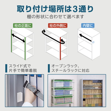 耐震度震度6強相当・収納物重量100kgに対応。スチール製のさまざまな棚に使用可能&貼るだけの簡単設置!