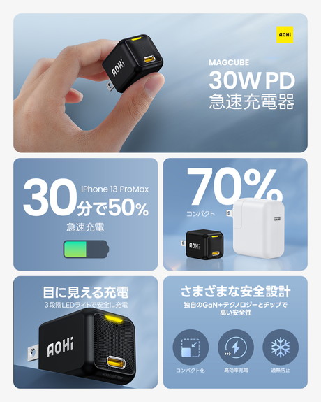 コンパクト、スマートフォンもタブレットなど、USB-Cが接続できる端末を急速充電。iPhone端末を純正品5Wの充電器より約3倍の速さで充電可能、LEDステータスライトで充電状態を3段階でお知らせ