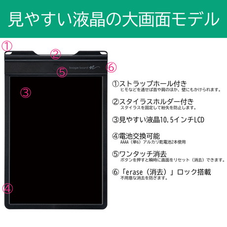 軽くて薄くて持ち運びにも便利な、新感覚の電子メモパッドです。ボタンを押すだけで文字が消えます。ハイコントラスト液晶を用いた大画面モデルです。【商品スペック】消去回数:約5万回色:黒画面サイズ:10.5インチ(217×157mm)本体サイズ:269×175×5.7mm電源:単6型アルカリ乾電池×2本素材:ABS重さ:320g付属品:本体、スタイラス、取扱説明書(保証書付)