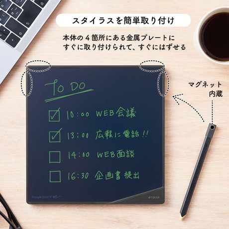 何度も書いて、すぐに消せる。壁にも掛けられる電子メモパッド。 スイスイ書いてパッと消せる。