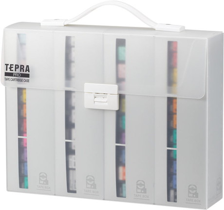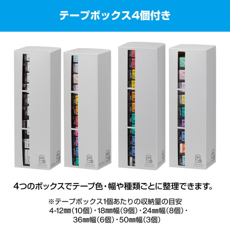 A4ボックスファイルサイズにテープカートリッジ(12mm幅40個)を収納。4つのボックスでテープ色・幅や種類ごとに整理できます。