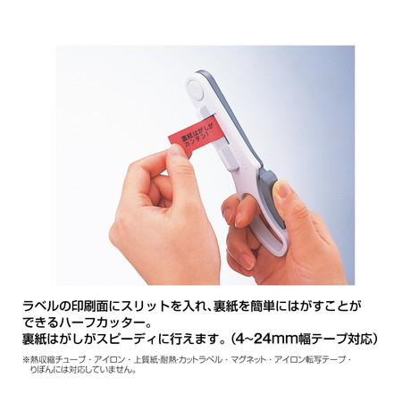 ラベルの印刷面にスリットをいれて、ラベルの裏紙をはがしやすくします。(4~24mm幅テープ対応)