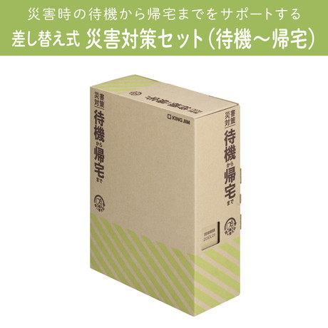 さまざまなニーズに合わせて10種類以上のラインアップから必要な防災用品を選べる「災害対策セット」シリーズと共に、キャビネットやデスクのわずかなスペースで防災用品を備蓄できます。一時的な待機を支援するための定番アイテムが4種類と帰宅の安全をサポートするアイテムが6種類同梱されています。防災準備を検討する時に、どんなものを準備すれば良いか迷った場合の最初のステップにオススメの防災商品です。差し替えボックスには使用期限があるものだけがまとまっています。背表紙には、大きく交換期限が記載されているため、交換時期を見逃すことがありません。棚に入れたまま交換が出来るので、管理が簡単です。防災担当者の労力を減らし、フードロス削減にもつながります。個装箱寸法:約100(W)×230(D)×313(H)mm質量:約2,200g賞味期限:5年間(保存水・クッキー)セット内容:?米粉パン(プレーン)×1袋?米粉パン(ココア)×1袋?クッキー(3本入り)×1袋?保存水×2本?非常用簡易トイレ×5個?ホイッスル×1個?アルミポンチョ×1枚?ナップサック×1枚?マスク×1枚?ポケットティッシュ×2個?軍手×1双