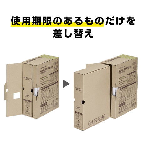 「STKS-100」のうち、使用期限のあるものだけを差し替えて交換可能。差し替えボックスには使用期限があるものだけがまとまっています。背表紙には、大きく交換期限が記載されているため、交換時期を見逃すことがありません。棚に入れたまま交換が出来るので、管理が簡単です。防災担当者の労力を減らし、フードロス削減にもつながります。個装箱寸法:約約65(W)×220(D)×300(H)mm質量:約1,800g賞味期限:5年間(保存水・クッキー・パン)セット内容:?米粉パン(プレーン)×1袋?米粉パン(ココア)×1袋?クッキー(3本入り)×1袋?保存水×2本?非常用簡易トイレ×5個