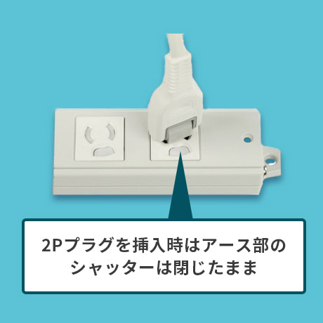 一般的なシャッター付きタップと異なり、差込口のシャッターが独立して動く構造を採用しています。 そのため、2Pプラグ接続時でも、使用しないアース口(接地極)のシャッターは閉じたまま。 内部へのホコリや異物侵入を徹底的に防ぎ、トラッキング火災のリスクを低減します。