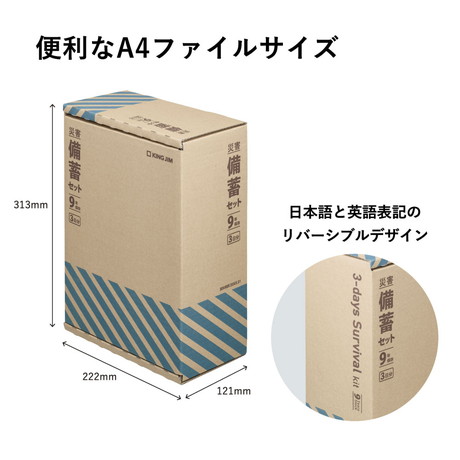 ●9年間の長期保存が可能!賞味期限が9年なので、期限が短い備蓄品に比べ入れ替え回数の削減ができ、トータルの手間とコストの削減に繋がります。3日分の500mlの飲料水やクッキー、非常用簡易トイレなど、避難先での滞在を支援する便利なセットです。●オフィスの分散備蓄にも活躍!A4ファイルサイズで省スペース設計の本商品は、備蓄倉庫に一括で置くのではなく各フロア・各部署に分散して備蓄する"分散備蓄"にも活用できます。デスクの引き出しやキャビネットにもすっきり収納が可能なので、「災害時にどのように配布するか」という課題を解決できます。●"もしも"に備えて防災備蓄を!大規模地震発生時は救助活動の妨げや二次災害を防ぐため、原則として3日間は安全な場所で待機し、4日目以降に状況を見て順次帰宅を開始することが想定されています。災害備蓄セット9年保存(3日分)は、避難先での滞在を支援する便利なセットです。※ 参考:内閣府「帰宅困難者等対策ガイドライン」(2024年7月改訂版)●外形寸法:約 W121×D222×H313 mm●質量:約3,110g ●主な材質:紙(外箱)●セット内容:保存水(500ml)×3本、クッキー(3本入)×9袋、非常用簡易トイレ(汚物収納袋+抗菌性凝固剤)×9個、ポケットティッシュ×3個