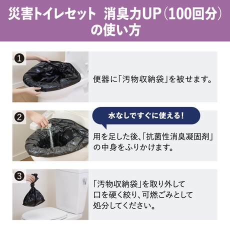 ●当社既製品と比べて消臭力がUP!抗菌性凝固剤に消臭剤を追加することで、消臭力をUPさせました使用から2時間後にはほぼ消臭完了!より強力にニオイを抑えます。●水なしですぐに使える!断水時でも溜めておいた水で流せばトイレを使用できると思いがちですが、震災などで破損した下水管では、流した汚物が逆流してしまうことも。便座やバケツに汚物収納袋をかぶせるだけで簡単に設置でき、断水や停電時でも衛生的に排泄処理が可能なので、災害時の不安を軽減します。●コンパクトなパッケージに100回分の簡易トイレを同梱!内閣府のガイドラインによると、備えるべき数量は最低でも3日分とされています。本製品には100回分の汚物収納袋と抗菌性消臭凝固剤がセットされており、複数人分の簡易トイレをコンパクトに備蓄できます。※参考:内閣府(防災担当)「大規模地震の発生に伴う帰宅困難者等対策のガイドライン」(2024年7月改訂版)●オフィスになじむA4ファイルサイズオフィスになじむA4ファイルサイズで、トイレ棚や流しの下にもすっきり収まります。他にもキャビネットや災害対策セットストッカーにまとめて収納するなど、分散備蓄が可能で場所を取らず、日常業務の邪魔になりません。●外形寸法:約 W96×D222×H313 mm●質量:約2,750g●主な材質:紙(外箱)●セット内容:汚物収納袋×100枚、抗菌性消臭凝固剤×100個、廃棄用大袋×5枚、取扱説明書×1枚