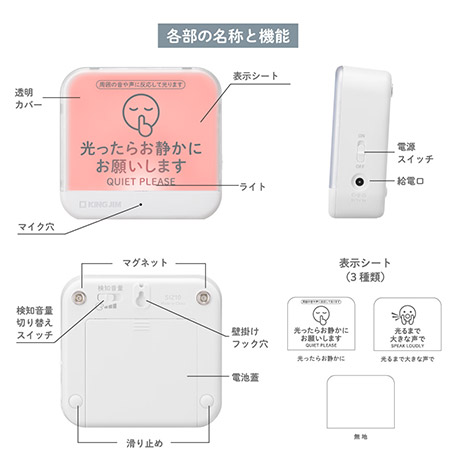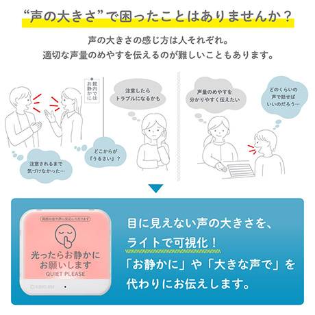 目に見えない声の大きさを光で可視化し、周囲にやさしく伝えるライトです。一定以上の声量を検知すると点灯し、静けさが求められる場所では注意喚起に、発声支援の場では声量の目安として活用できます。注意する側・される側の心理的負担を減らし、誰もが気持ちよく過ごせる環境づくりをサポートします。●外形寸法:約W95×D34×H90mm ●質量:約113g(乾電池含まず)●設置方法:据え置き、マグネット、壁掛け ●材質:ABS(本体)、PC(透明カバー)●検知音量:小(約60dBA)、中(約70dBA)、大(約80dBA)●電源:単3形アルカリ乾電池×4本(別売)、USB給電(ACアダプタ別売)●動作環境:温度5~35℃、湿度30~80%(非結露)●保存環境:温度-10~50℃、湿度5~80%(非結露)●電池寿命:約100日(1日12時間使用、100回検知想定)●セット内容:本体、給電ケーブル(USB Type-A to DC 約2m)、表示シート3種(お静かに・大きな声で・無地 各1枚)、取扱説明書(保証書付)