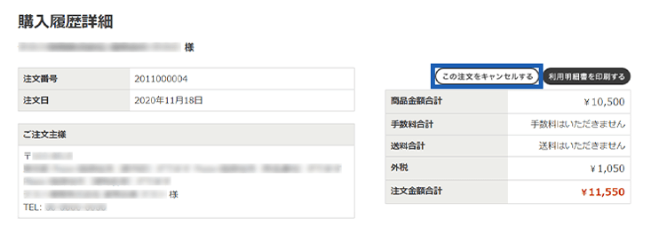 購入履歴詳細画面の右上に「この注文をキャンセルする」が表示されておりましたら、お客さまご自身よりキャンセル処理が可能です。「この注文をキャンセルする」をクリックすると「キャンセルしてもよろしいですか」と表示されます。「OK」をクリックし、キャンセル処理が完了となります。
